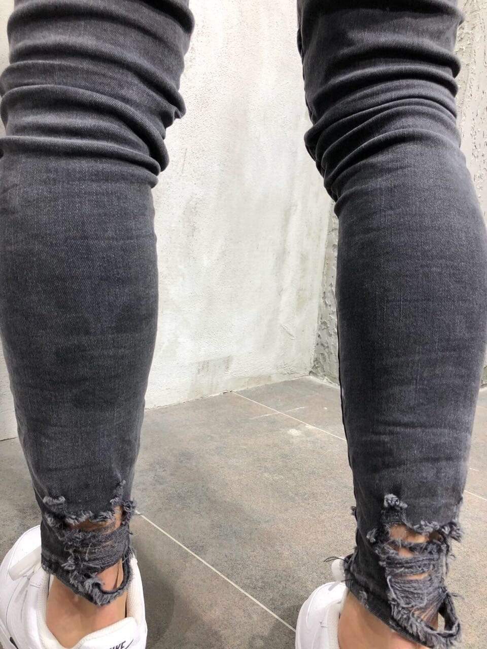 Slim-fit jeans with zipper fly and regular waist. Features a distressed design with white paint splatter print. Hems are ripped, knees are decorated with straps.