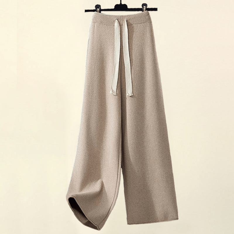 Made with luxurious and warm fabrics for optimal softness, the ensemble includes a knitted turtleneck and matching wide-leg pants.