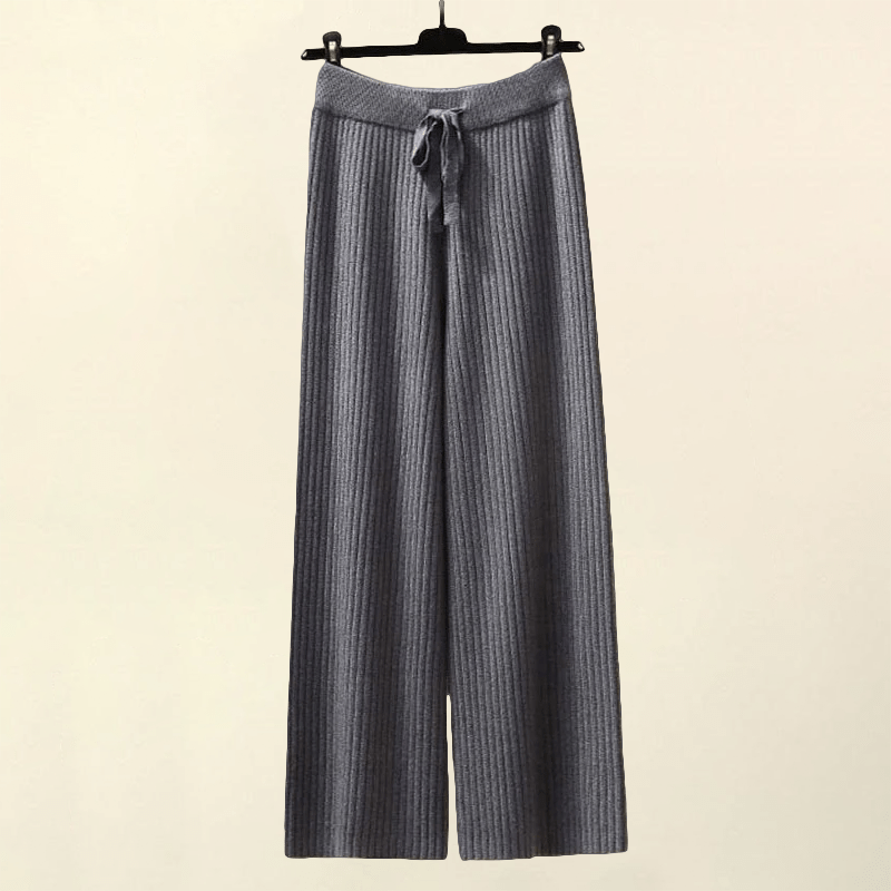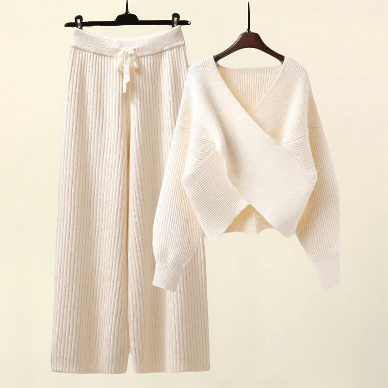 Crafted from a sumptuous cotton blend, the ensemble consists of a knitted sweater and matching wide-leg pants.